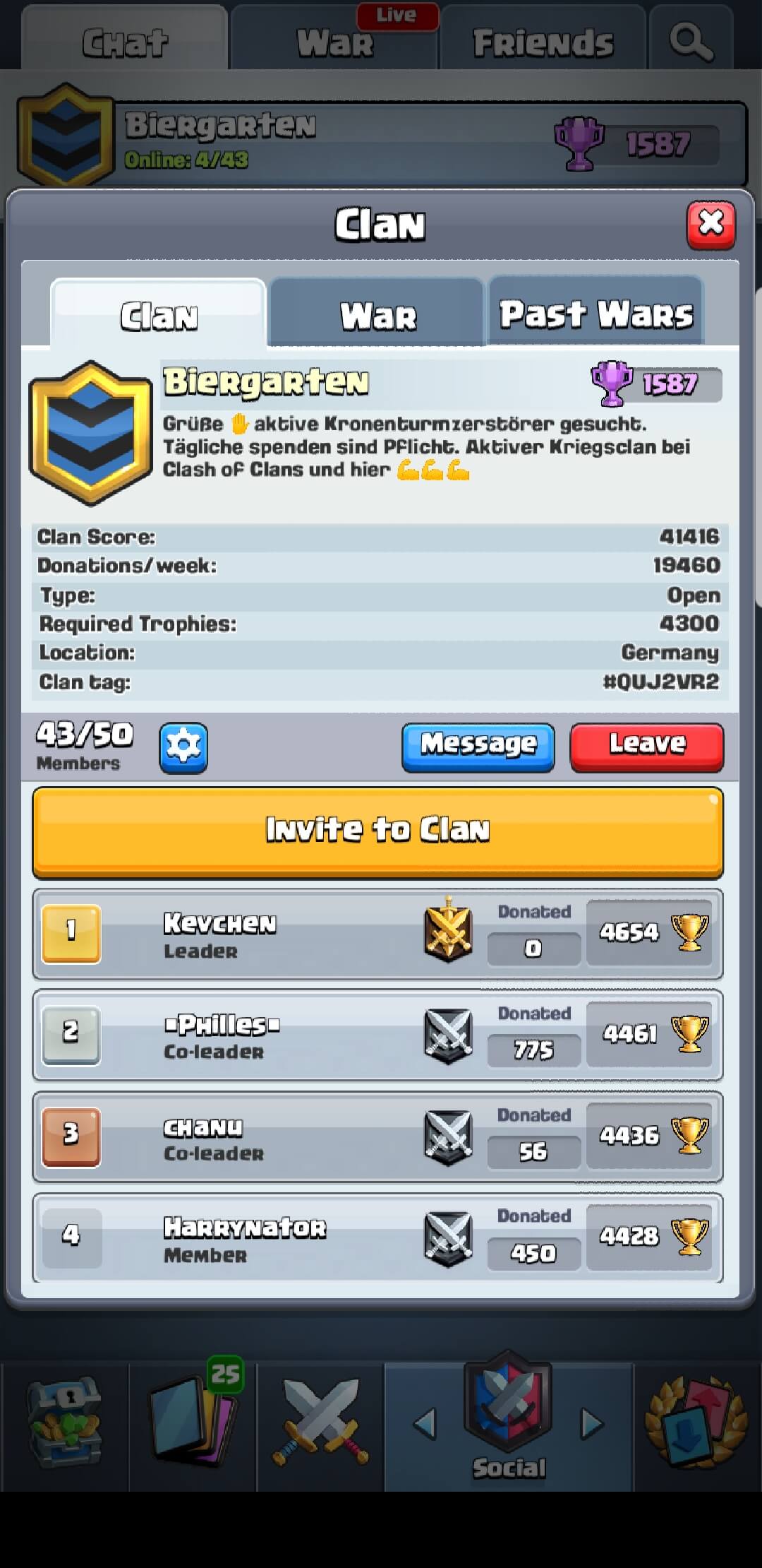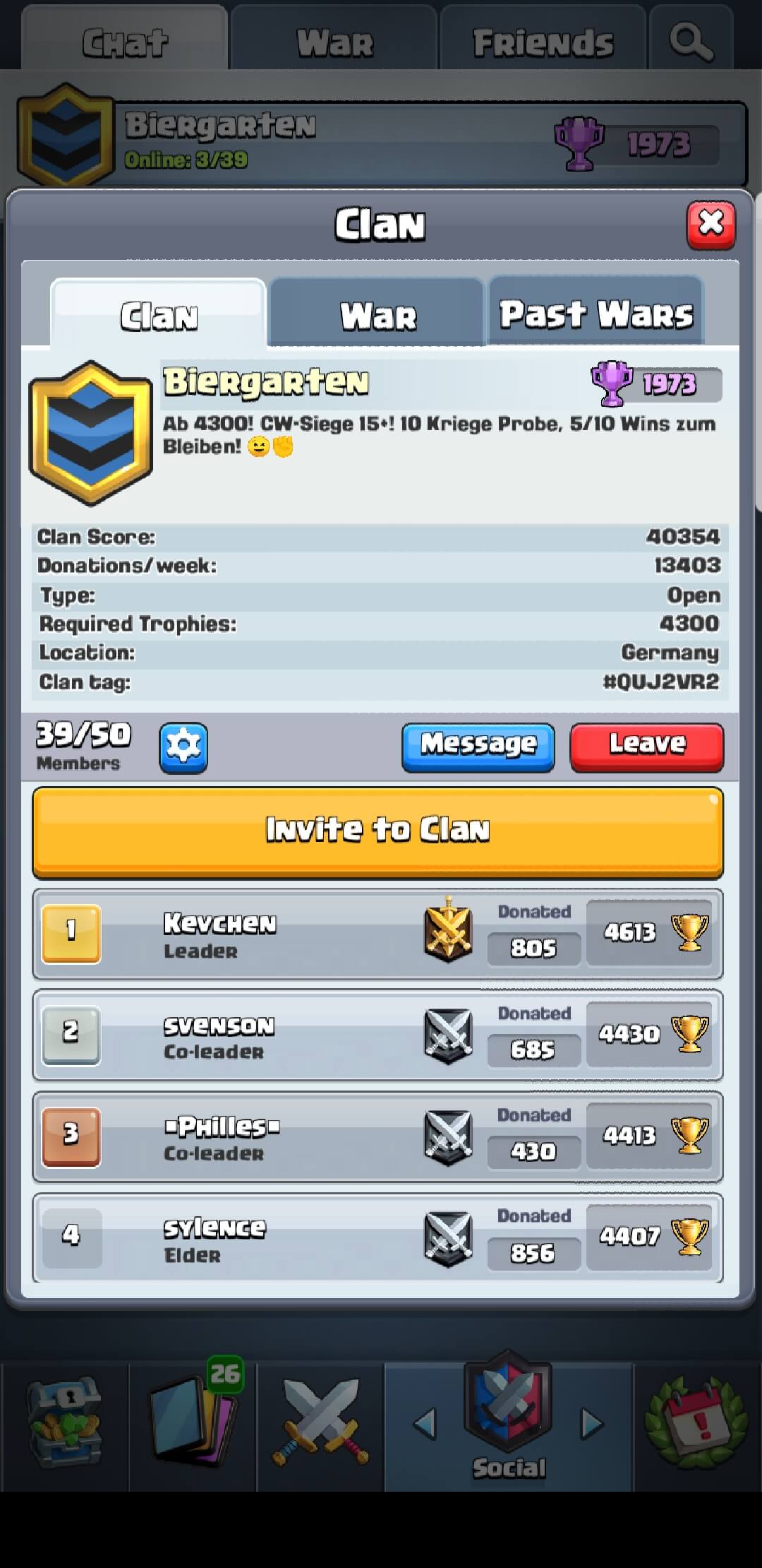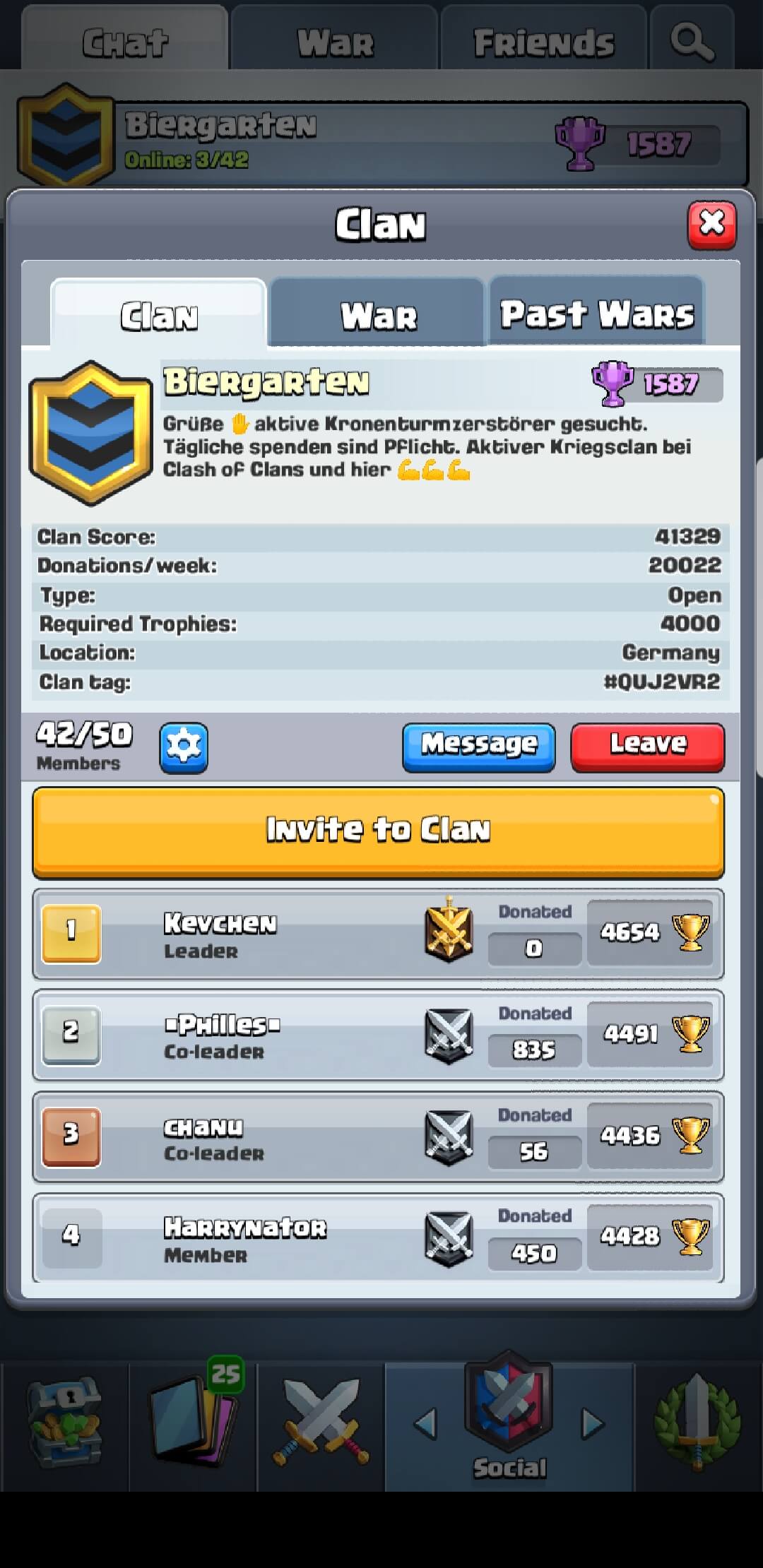Wir vom Clan "Biergarten" (#QUJ2VR2) suchen nach aktiven Clankriegsbestreitern ab 4300 Trophäen, oder 15 Kampftagssiegen, um weiterhin einen erfolgreichen Aufstieg zu feiern!