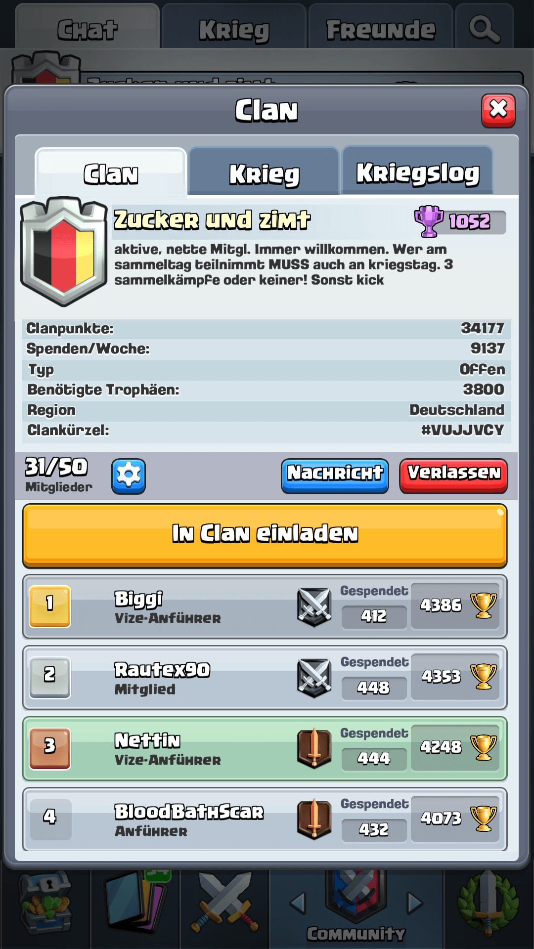 Wir haben mit Beginn des Krieges fleißig aussortiert... Sind nun bei einer 100% Teilnehmerrate beim Endkampf, aber nur noch 30/50 Mitglieder. 940 clantrophäen derzeit. Suchen nun ab 3800 eigentlich. Höflicher Umgang und es wird immer fleißig gespendet...