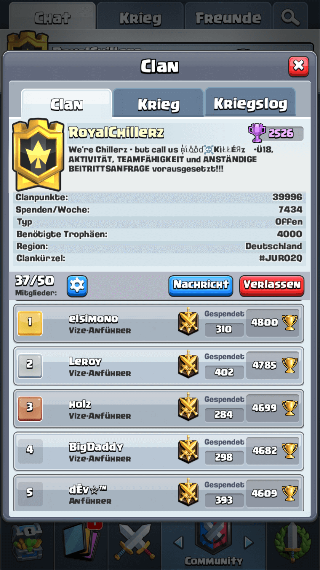 Hallo wir sind die RoyalChillerz und brauchen noch ein paar aktive Clanmitstreiter ü18. Derzeit sind wir 30 Clanmitglieder, die täglich aktiv sind. Davon nehmen etwa 25 mitglieder an unserem täglichen Clanwars teil. Auf line gibt es schon Gruppen zur besseren Kommunikation, wo wir dann auch spaßigere Gespräche führen.