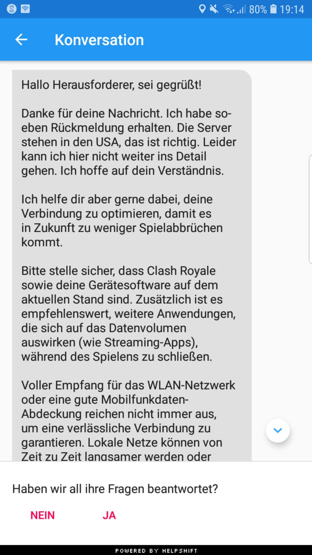 Das Supercell europäische Server zur Verfügung stehen ist ja längst bewiesene Sache und das sich die Entwicklung spätestens nach meiner Supportanfrage inkl. Beweisen bewusst ist, dass die Konfiguration des Routings teils fehlerhaft ist, ist auch klar. Ich vermute, dass die Entwicklung das freilich auch vorher schon wusste, ihnen aber der Aufwand der Konfiguration einfach zu groß ist und der "typische CR Spieler" soetwas auch gar nicht merkt. Das ist der Grund, warum ich da soviel Druck ausübe. Es ist für die Entwicklung kein Problem das zu ändern.