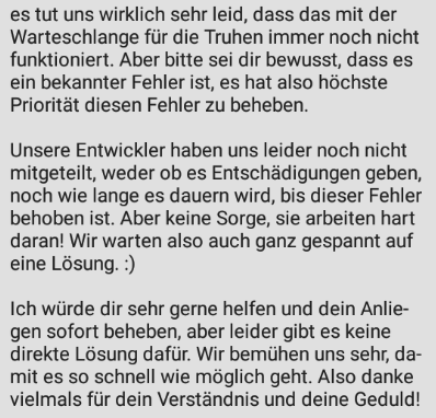 den Truhen bug habe ich auch und habe da auch schon den Support angeschrieben. Der bug ist bekannt und sie hoffen ihn diese Woche noch zu fixen. Bis dahin bleibt nur abwarten.