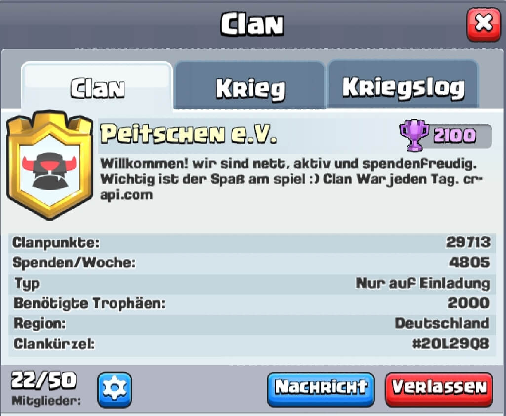 ps. Falls euer clan eine mindest Trophy Anforderung von 4000 hat, bedenkt das wir eine starke und AKTIVE gruppe sind. ;)