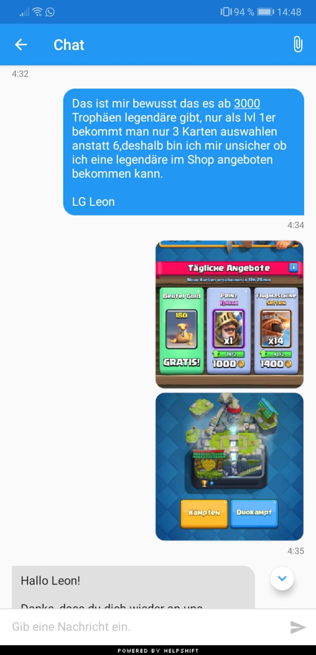 Im Anhang sende ich nochmal den gesamten Verlauf zwischen mir und dem clash royale Support das man meine 100te Erklärungen sieht und auch sieht wie der Support immer wieder das selbe sagt und mir anscheinend nicht zuhört was mehr als unverschämt ist!!