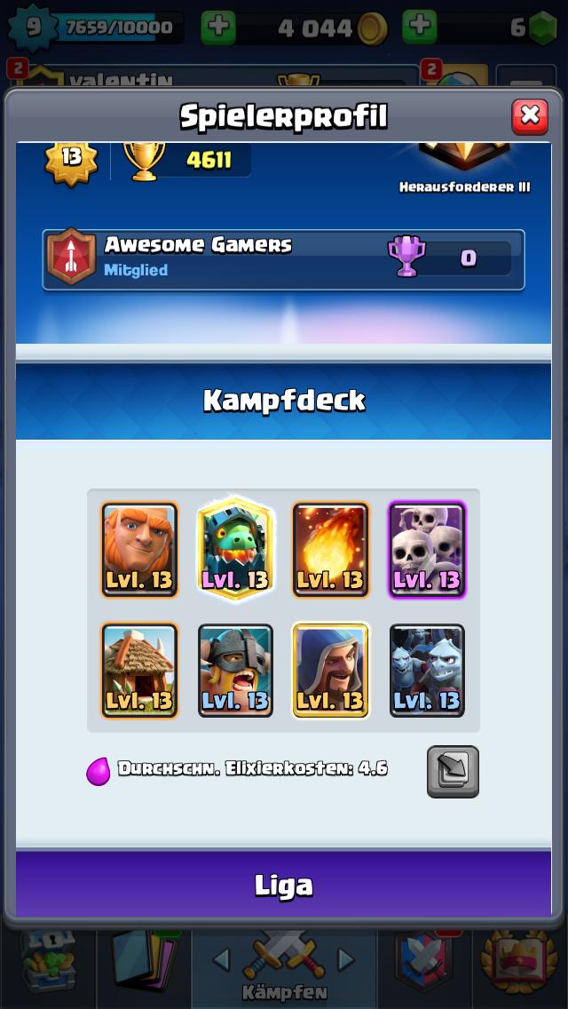 was soll man machen wenn man bei 4,6K diesen Gegner kriegt und alle seine Karten im Deck Level 9 hat? Und das passiert öfter! Es läuft gut ich kriege Level 10er oder 9er Gegner mit Karten auf Level 9-10 (selbst meine schlechtesten Gegner haben meistens ihr Deck auf Level 10) und dann kommt da so ein Level 13 Spieler! Was kann man da machen? Einen von diesen Gegnern seht ihr unten ich habe ein Screen von seinem Profil gemacht